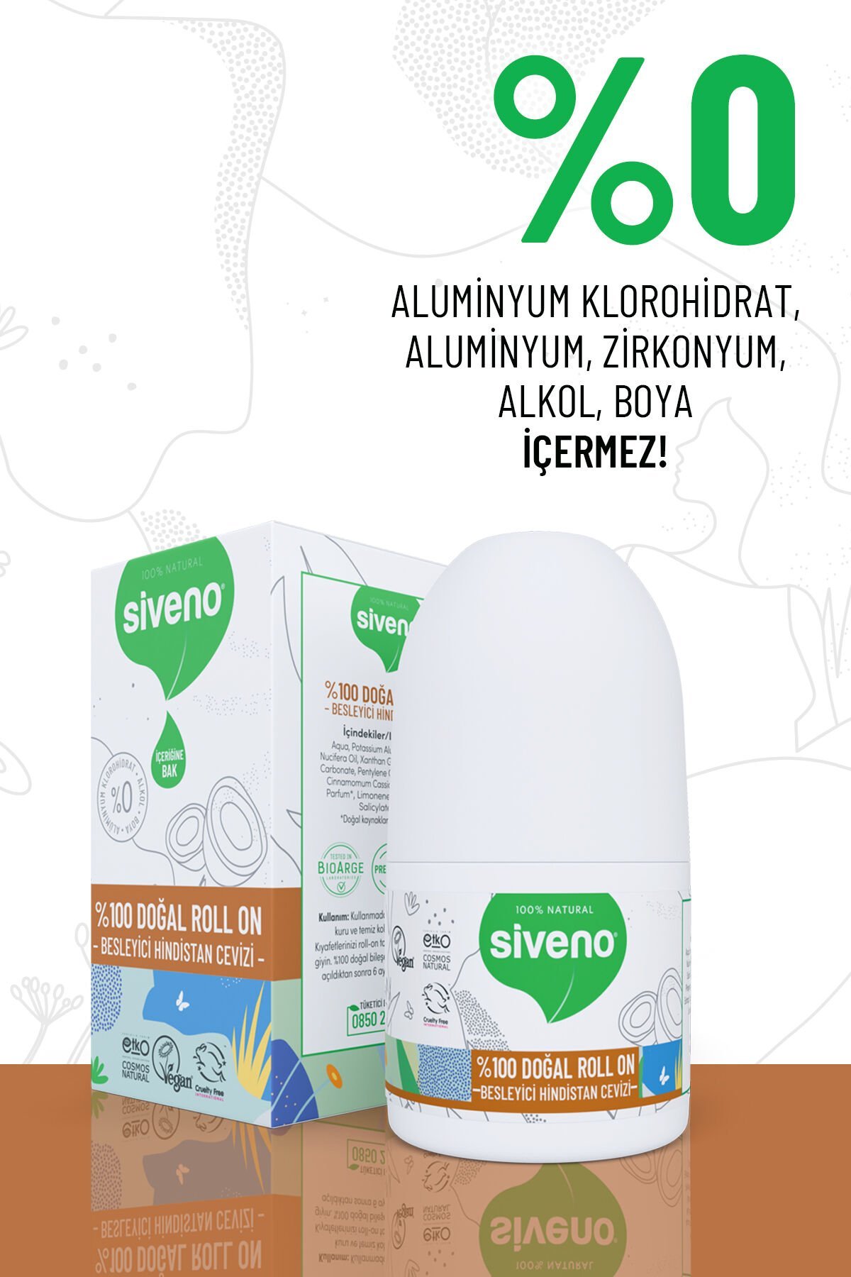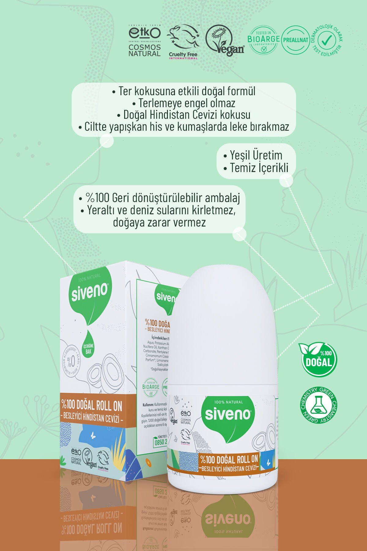 Siveno %100 Doğal Roll On Hindistan Cevizli Deodorant Ter Kokusu Önleyici Bitkisel Lekesiz Vegan 50 ml; İçeriğindeki hindistan cevizi yağı ile cildi besler. ; Üretiminde tamamen doğal bir mineral tuz olan potasyum alum kullanılmıştır. ; Potasyum alum koltuk altındaki gözenekleri kapatmaz ve terlemeye engel olmaz. ; Terlemeyi önleyerek doğal süreci bozmak yerine kötü kokulara neden olan bakterileri etkisiz hale getirerek ter kokusunu önler.; Doğal Roll-On içeriğinde yer alan skualen hassas cildinizi yıpranmaya karşı koruyan güçlü bir antioksidandır.; Alüminyum Klorohidrat, Alüminyum Zirkonyum, Alkol ve Boya İÇERMEZ!; Vegan sertifikasına sahiptir.; Sahip olunan Cruelty Free sertifikası ile hayvanlar üzerinde test edilmediği kanıtlanmıştır.; Siveno, doğada geri dönüşen ambalajlar kullanır. Yeraltı ve deniz sularını kirletmez, doğaya zarar vermez.;Kullanım Önerisi: ;Kullanmadan önce çalkalayın. Ürünü kuru ve temiz koltuk altına uygulayın. Kıyafetinizi roll on tamamen kuruduktan sonra giyin.