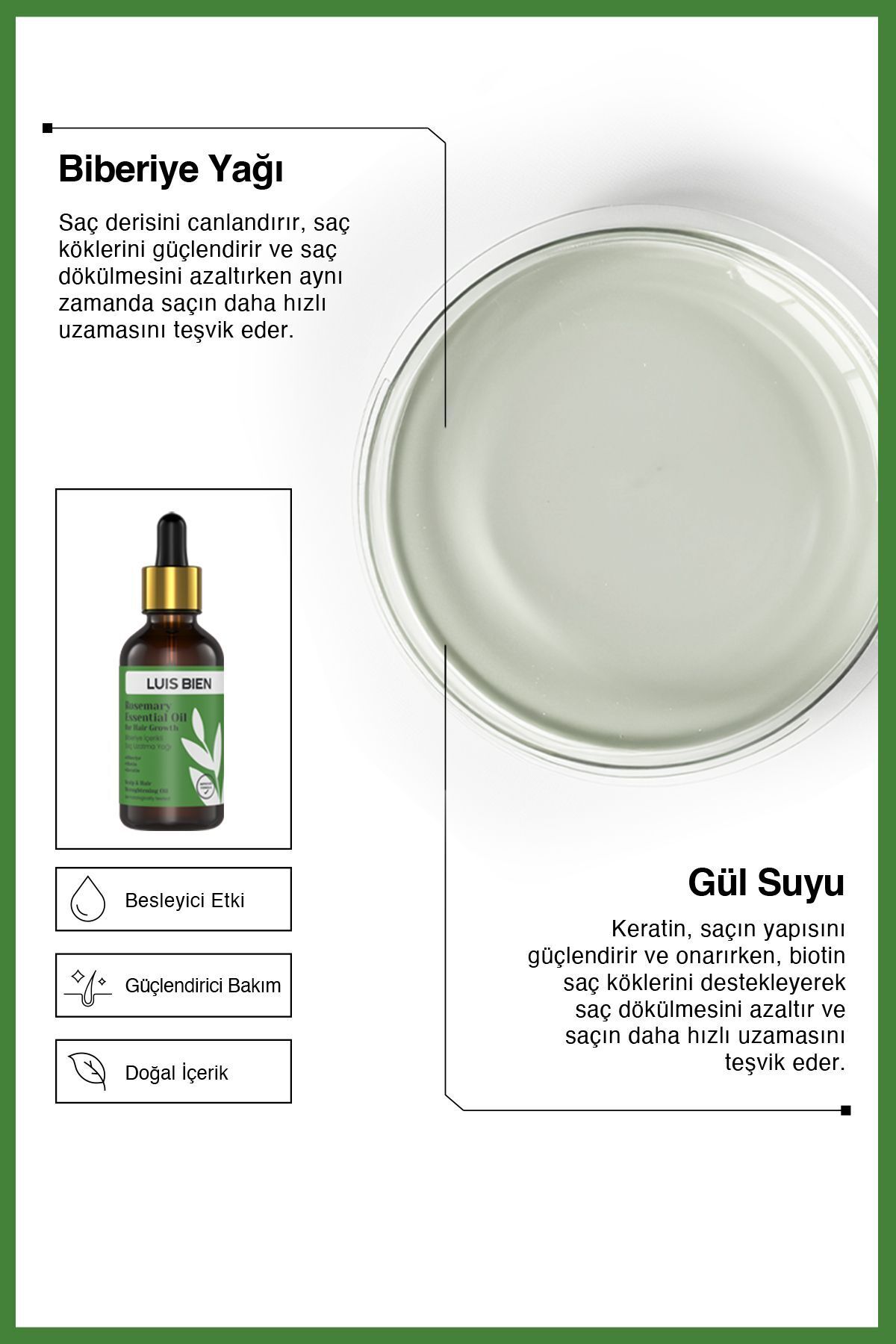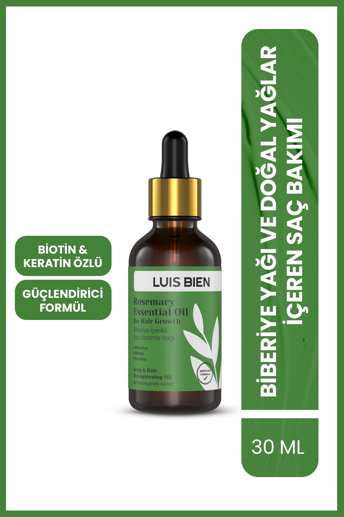 Ürün Açıklaması;Luis Bien “Biberiye Yağı Serumu”, azaltmaya, saç köklerini güçlendirmeye ve görünümde yoğun besleyici etki yaratmaya yardımcı özel bir formüle sahiptir.; Biotin ve keratin ile zenginleştirilmiş içeriği sayesinde saç telleri daha dayanıklı hale gelir, kırılmalar azalır ve sağlıklı uzama desteklenir.; Saf biberiye yağı ile saç derisi beslenir; mentol ve okaliptüs ile ferah ve uyarılmış bir his verir.; Hafif yapısı sayesinde saçta yağlılık hissi bırakmadan hızlıca emilir ve parlak görünüm sağlar.; Tüm saç tipleri için uygundur.; ;✅ Öne Çıkan Faydalar;Biotin ve keratin içeriği saç tellerini güçlendirir, kırılma ve incelmeye karşı koruma sağlar.; ;Saf biberiye yağı ile saç derisini besler, oluşumunu destekler ve sağlıklı uzamayı teşvik eder.; ;Mentol & okaliptüs etkisiyle ferahlık hissi verir, saç derisindeki gerginlik ve rahatsızlığı hafifletir.; ;Hafif ve yoğun olmayan formülü sayesinde saçta ağırlık yapmaz; parlaklık ve dolgun görünüm kazandırır.;Tüm saç tiplerine uygun; kadın-erkek kullanımı için ideal.; ;