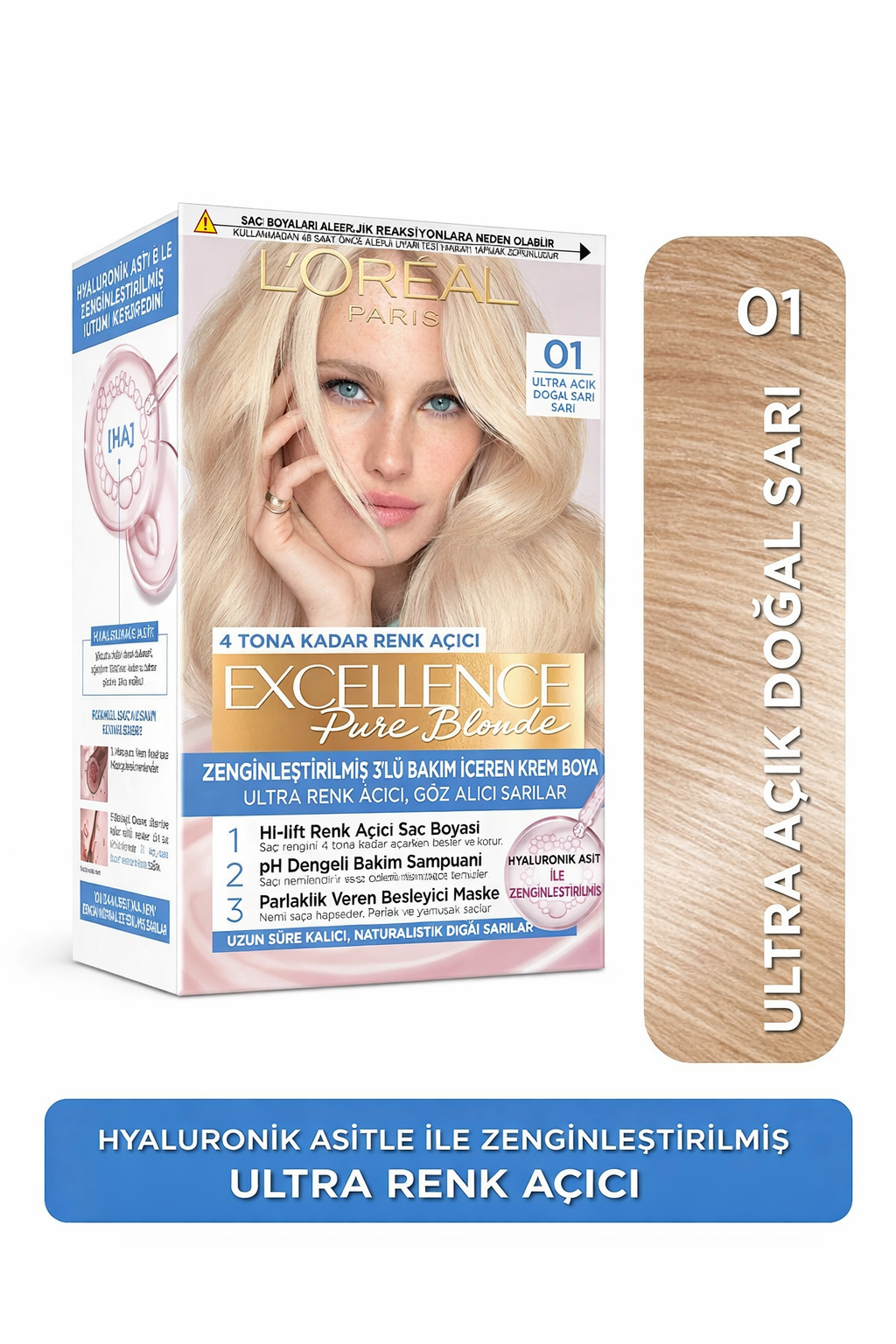 #Özel Ürün Üç aşamalı komple bakım; Pro-keratin + Seramid + Ionene G ile güçlendirir, korur, yeniler; 100% beyaz kapama; Zengin, parlak, uzun süre kalıcı saç rengi; Excellence Krem Boya zenginleştirilmiş 3'lü bakım ile saçlarınızı güçlendirir, korur ve yeniler; Dirençli beyazlarda bile %100 beyaz kapama sağlarken saçlarınız daha zengin, parlak ve uzun süre kalıcı mükemmel renk sonucuna ulaşır; Boya Öncesi Koruyucu Serum' u saçlarınızın her yerine uygulayın; Krem Saç Boyasını, Oksidan Krem şişesinin içine dökün ve kapağı kapadıktan sonra iyice çalkalayın; Saçınıza uygulayın; 30 dakika bekleyin ve saçlarınızı su ile duruladıktan sonra Boya Sonrası Koruyucu Bakım Kremi' ni uygulayın; SARI TÜM CİLT/SAÇ TİPLERİ Her yaşa uygun Pro Keratin & Seramid & Ionene G;