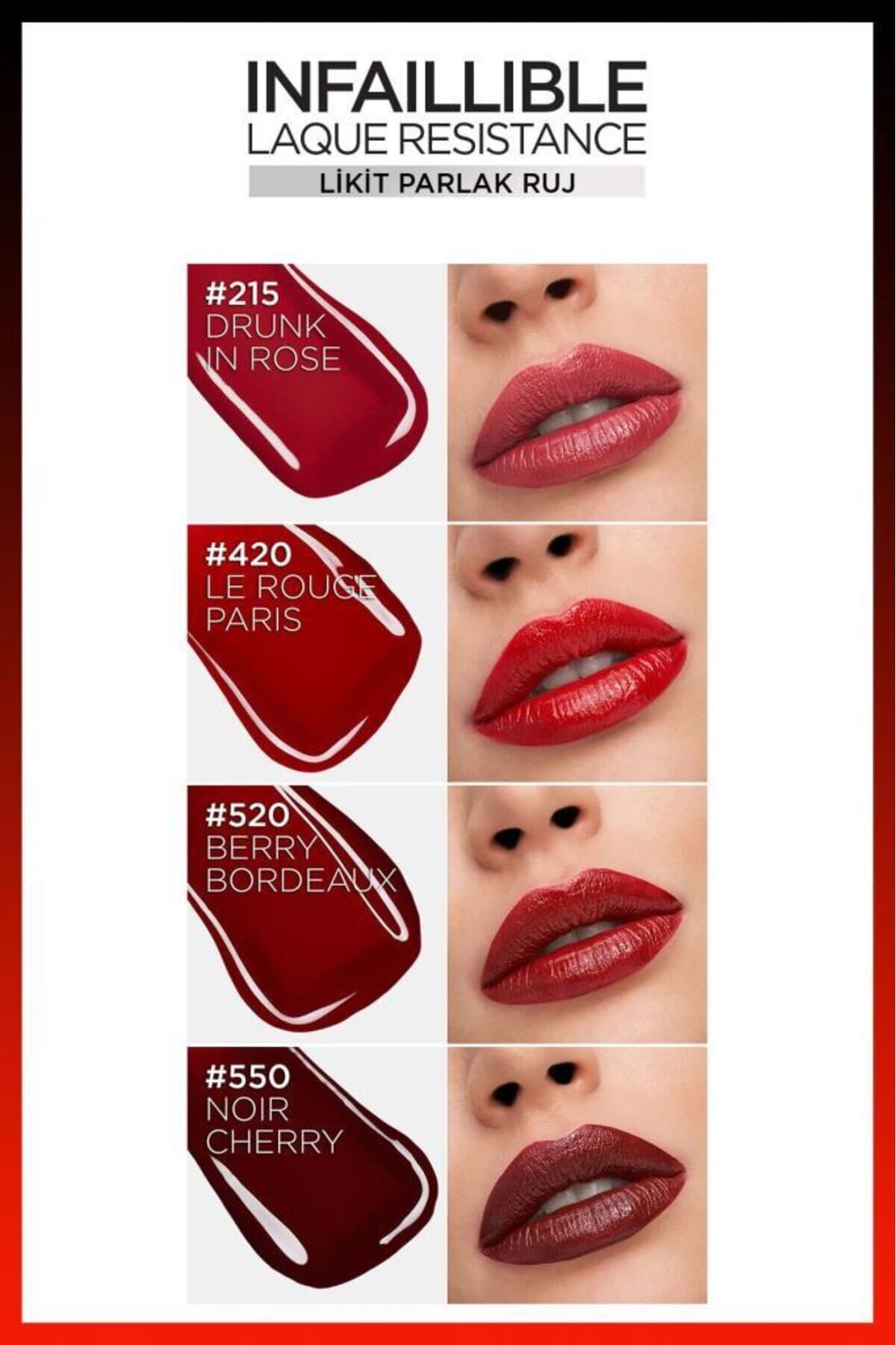 Yoğun parlak ve karşı konulamaz renkler: INFAILLIBLE LAQUE RESISTANCE LİKİT PARLAK RUJ! Infaillible dayanıklı makyaj ailesinin en yeni üyelerinden Infaillible Laque Resistance Likit Parlak Ruj kolay uygulama sağlayan açılı uçlu fırçasıyla tek uygulamada yoğun ve güçlü renkler sunarken tam 16 saate kadar* kalıcı nemlendirici etkili parlaklık sağlar. Nemlendirici etkili parlaklık Squalane içeren formülü ile dudakları nemlendirir Dudaklarda yapışkan his bırakmaz Dudakları kurutmaz *Tüketici testi, 109 kadın