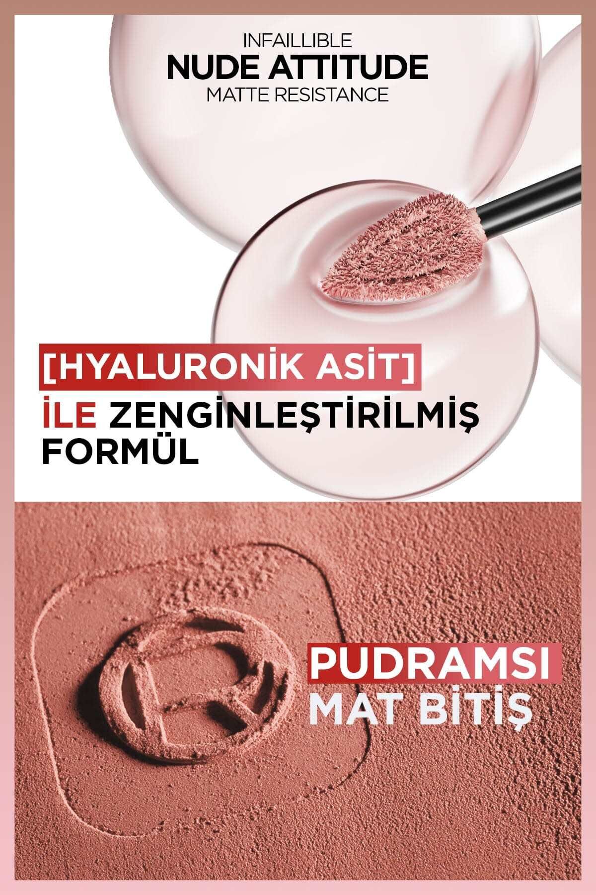 Matte Resistance Nude Attitude ile karşı konulamaz nude dudaklar! Infaillible dayanıklı makyaj ailesinin üyesi Infaillible Matte Resistance Likit Mat Ruj kolay uygulama sağlayan yumuşak fırçasıyla tek uygulamada yoğun renkler sunarken tam 16 saate kadar; kalıcı pudramsı mat bitişi sayesinde daha dolgun bir dudak görünümü sağlar; Pudramsı mat bitiş Likit mat ruj kolaylığı Gün boyu rahatlık hissi Transfere dayanıklı Dudaklarınızı nemlendirir Dolgun görünen dudaklar; Tüketici testi, 171 kadın;;