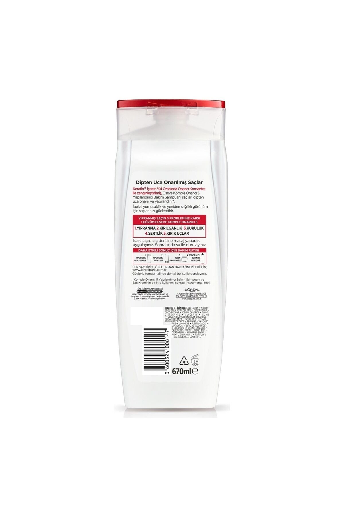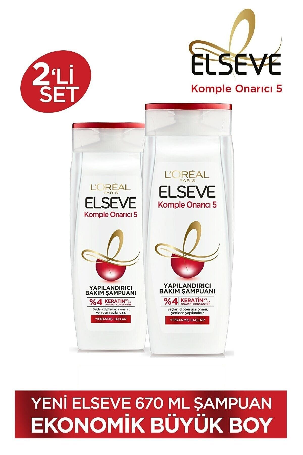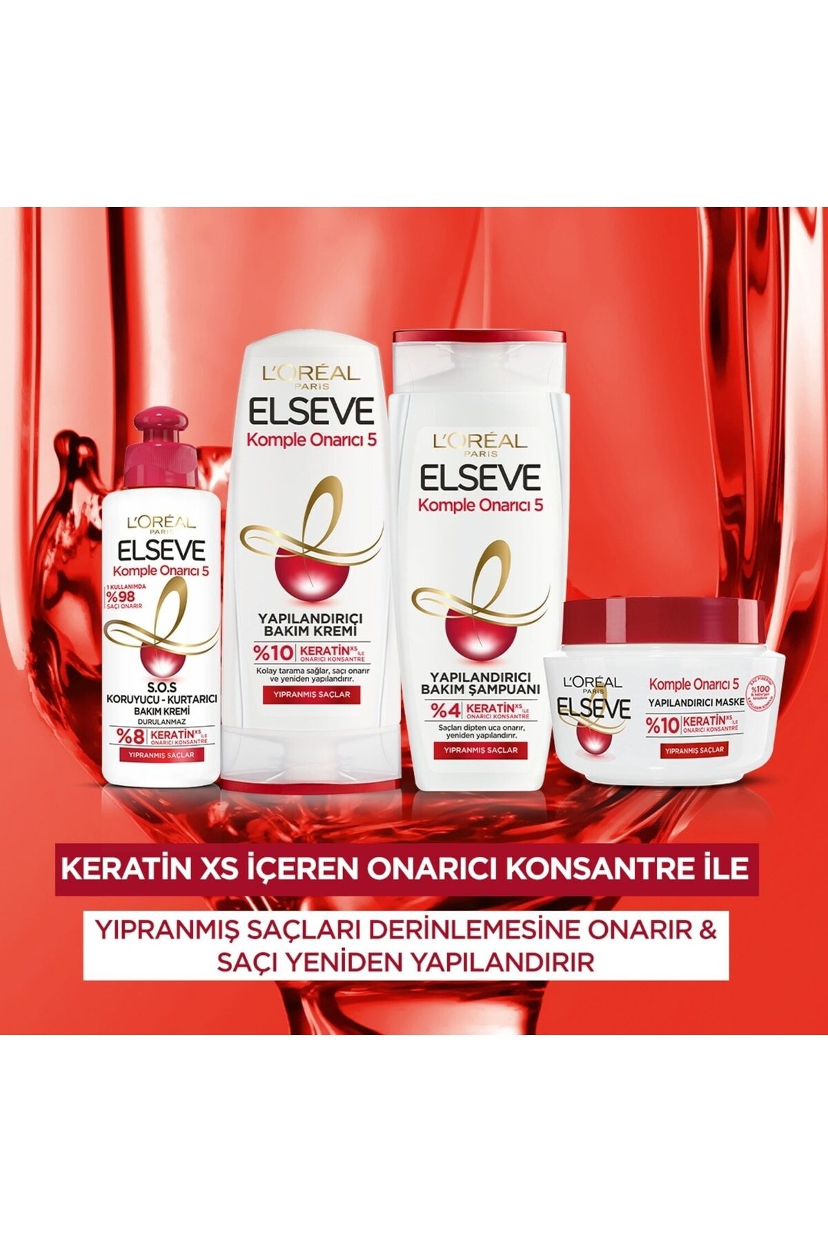 Elseve Komple Onarıcı 5 şampuan, Keratin XS içeren onarıcı konsantre ile yıpranmış saçın 5 sorununa 1 çözüm bularak, saç telini onarır ve saçın yapısını güçlendirir. ; Keratin XS içeren %4 oranında onarıcı konsantre ile zenginleştirilmiş Elseve Komple Onarıcı 5 Yapılandırıcı Bakım Şampuanı saçları dipten uca onarır ve yapılandırır*. ; İpeksi yumuşaklık ve yeniden sağlıklı görünüm için saçlarınızı güçlendirir. ; *Komple Onarıcı 5 Yapılandırıcı Bakım Şampuanı ve Saç Kreminin birlikte kullanımı sonrası instrumental testi Kullanımı: Islak saça masaj yaparak uygulayın, daha sonra durulayın.;