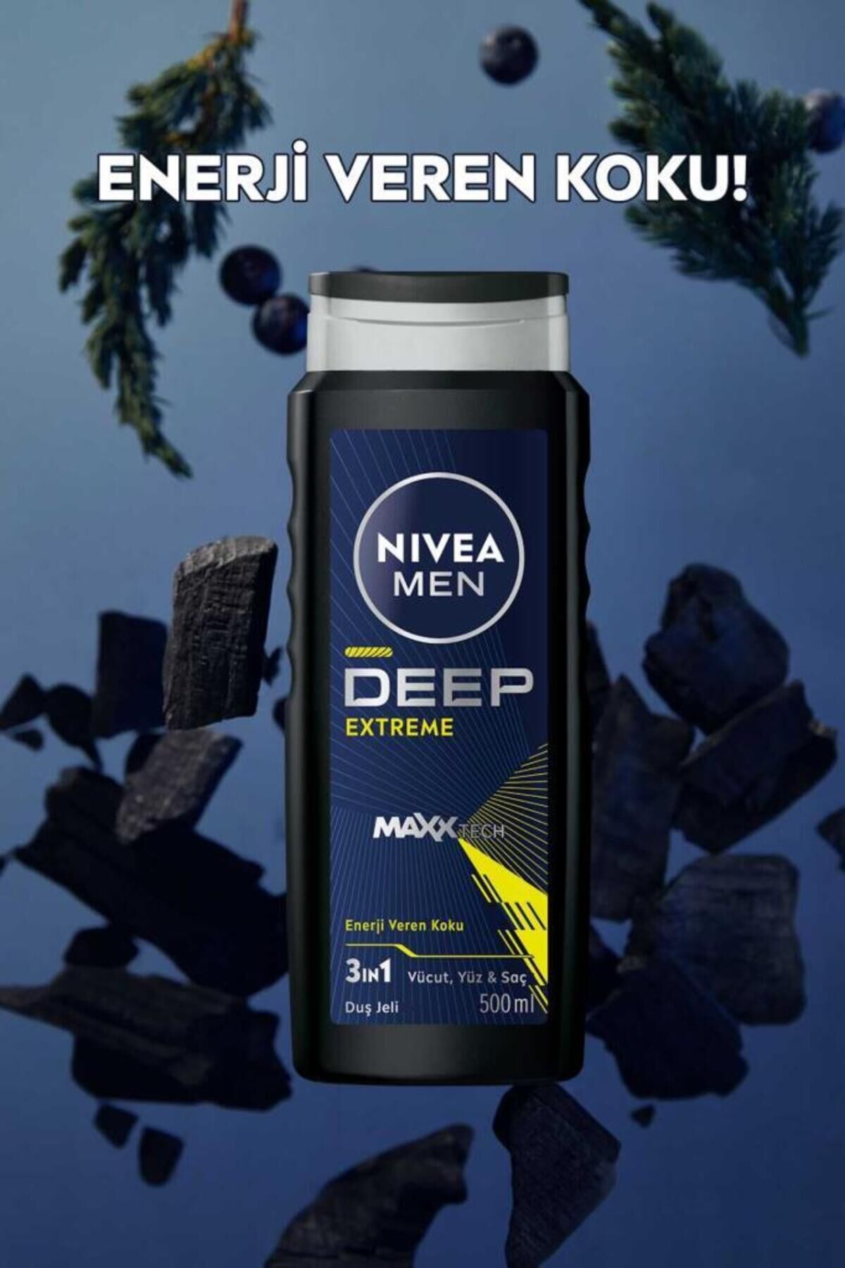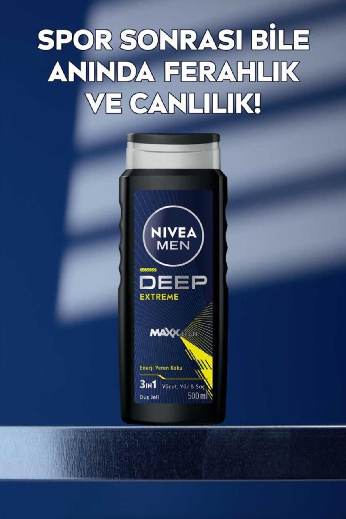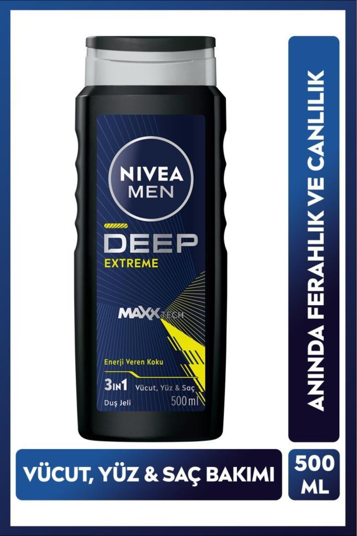 • Özel formülümüz kuru ve ferah kalmanızı ve özgüvenle hareket etmenizi sağlar.; • NIVEA MEN Erkek Deep Extreme Duş Jeli: Erkekler için komple temizlik sağlar.; •Deep Extreme Duş Jeli, vücut saç ve yüz için kullanıma uygundur.; • Etkili ve yumuşak yapısı ve enerjik kokusu ile bakım yapan köpüğe dönüşerek cildinizi ve saçlarınızı canlanmış ve temizlenmiş hissetmenize yardımcı olur.; •Ferahlatan duş deneyimi ile gün boyu rahatlık sağlar.; •PH değeri cilt ile uyumludur.; •MAXXTECH formülü enerji veren kokusuyla spor yaptıktan sonra bile anında ferahlık sağlamak ve canlılığı korumak için tasarlanmıştır.; • NIVEA İle Kişisel Bakım Rutininiz!: NIVEA MEN Erkek Deep Extreme duş jelinizi ile duşunuzu aldıktan sonra NIVEA MEN Deep Extreme deodorantınızı temiz koltuk altınıza uygulayın.; •Ciltle uyumu dermatolojik olarak kanıtlanmıştır.