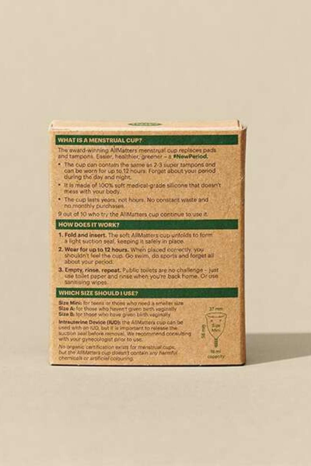 AllMatters/OrganiCup, pedleri ve tamponları değiştiren ödüllü adet kabı / regl kabıdır. Daha kolay, daha sağlıklı, daha akıllıcadır. Tek bir AllMatters/OrganiCup regl kabını senelerce kullanabilirsiniz.;Hangi AllMatters/OrganiCup modelini seçmeliyim?;• Model A (Hiç doğum yapmamış yada sezeryan doğum yapmış kişiler için);• Model B (Normal doğum yapmış kişiler için);• Model Mini (Gençler yada daha küçük boyuta ihtiyaç duyan kişiler için);AllMatters/OrganiCup Regl Kabını Nasıl Kullanacağım?;AllMatters/Organicup regl kabını katlayın ve takın. AllMatters/OrganiCup regl kabı açılacak ve hafif bir vakum ile yerine sabitlenecektir. 12 saat sonra (akışınıza bağlı süre kısalabilir) çıkarın ve tuvalete boşaltın. Durulayın ve tekrarlayın.;C şeklinde katla ve yerleştir;AllMatters/OrganiCupregl kabı, güvenli bir şekilde yerinde kalmasını sağlamak için hafif bir emiş oluşturmak için vajina içinde açılır ve günlük hareketlerinizden etkilenmez (amuda kalksanız dahi).;12 saat boyunca aralıksız kullanım;AllMatters/OrganiCup, ped ve tamponlardan 3 kat daha fazla sıvı toplar, bu da sabah ve akşam (akışınıza bağlı olarak) boşaltmanız gerektiği anlamına gelir.;Boşalt, durula ve tekrar tekrar kullan;AllMatters/OrganiCup’ı ped ve tamponlar gibi sadece birkaç saatliğine değil yıllarca kullanabilirsiniz. Sizin ve dünyamız için büyük tasarruf anlamına gelir.;Ürün temizliği için AllMatters Regl Kabı Temizleme Jeli ve Regl Kabı Temizleme Mendili ürünlerini satın alabilirsiniz.;Ayrıca avantajlı paket olarak tüm bu ürünlerin bir arada olduğu Hijyen Seti'ni satın alabilirsiniz.