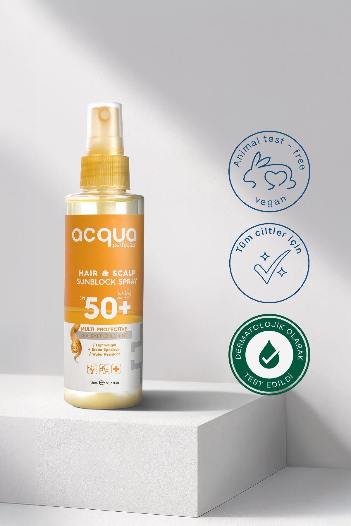 Güneşin zararlı UVA/UVB ışınlarına karşı özel olarak geliştirilen Acqua Perfection Hair & Scalp Sunscreen SPF 50, saç derinizi ve saç tellerinizi korumaya yardımcı olur.; Hafif ve yağsız formülü sayesinde saçlarda ağırlık yapmaz, beyaz kalıntı bırakmaz ve doğal görünümünü bozmadan koruma sağlar.; Güneş, deniz suyu ve havuz kloruna karşı saçları güçlendirmeye ve kurumasını önlemeye yardımcı olur.