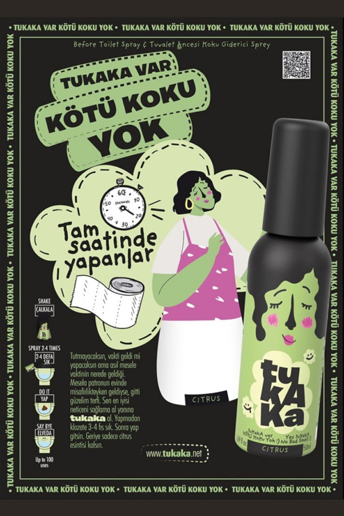 TAM SAATİNDE YAPANLAR TUKAKA, tuvaletteki kötü kokuyu gideren vearkanızdan güzel bir koku bırakmanızı sağlayan koku giderici spreydir.; TukakaCitrus’u kullanmadan önce şişeyi çalkalayın.; Çalkaladığınız spreyi 3-4 defaklozetin içerisine sıkın.; Klozete oturun ve yapacağınızı yapın.; Sifonuçektikten sonra arkanızdan citrus esintisi kalsın.; TUKAKA: Alkol, paraben, phthalate, aerosol, formaldehyde içermez.; Natural essential oiliçeriği sayesinde kötü kokuya düşman, doğaya dosttur.; Bitmedi! TUKAKA içerisindeki patentli koku giderici hammaddesi ile kötü kokuyubaskılamak yerine komple yok eder.; Yetmedi! TUKAKA Cruelty- free ve vegan üründür.; Ayrıca! TUKAKA 100 kullanıma kadar etkilidir.; E daha ne olsun! Fıs fısla, kötü koku yok olsun.; KOKUNOTALARI Üst Limon, Okaliptüs, Aldehit Orta Citronella, Gül Alt Musk, Vetiver