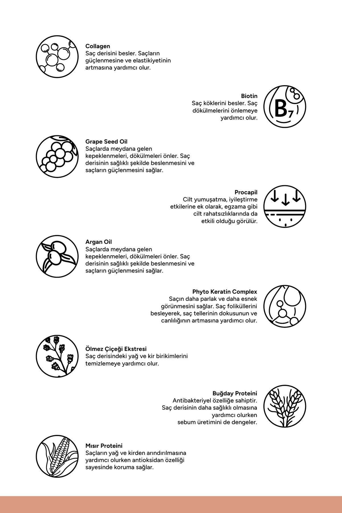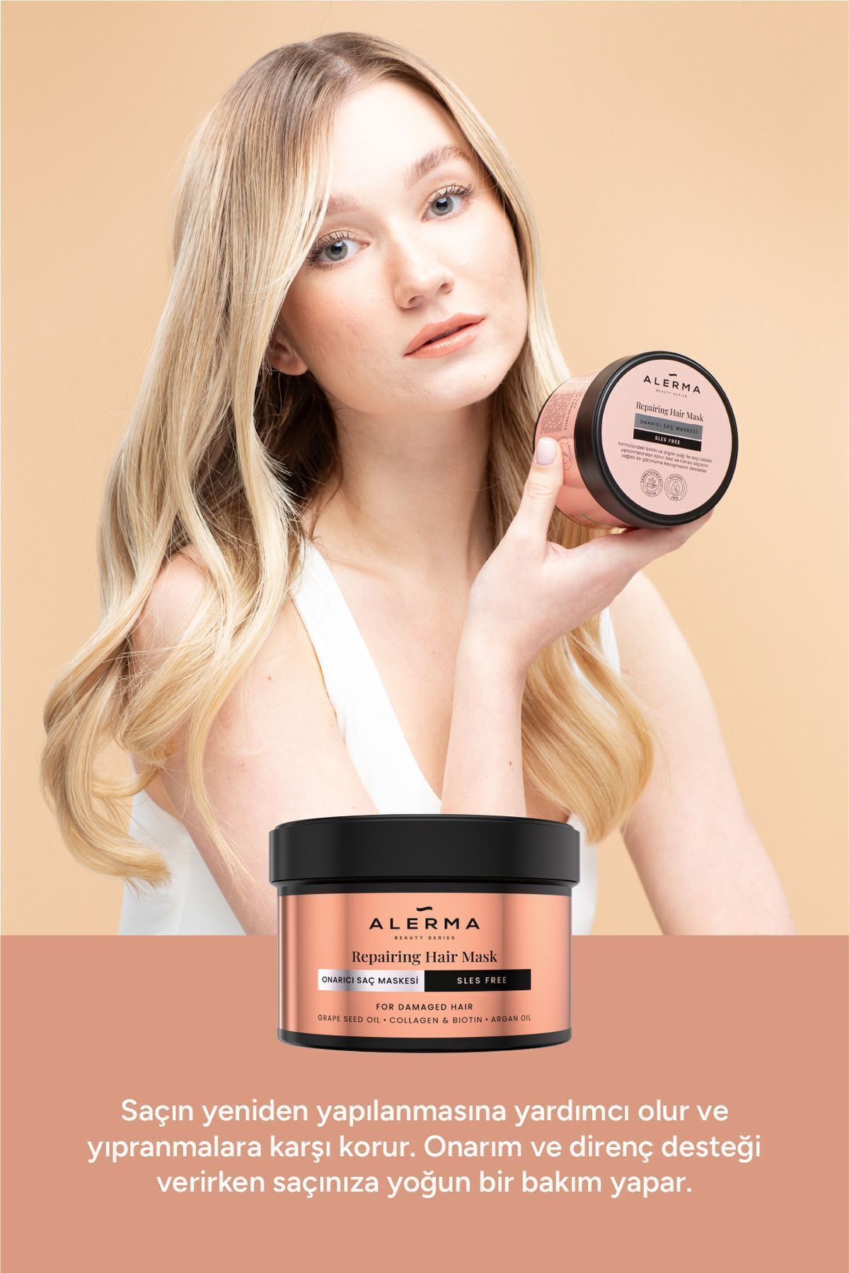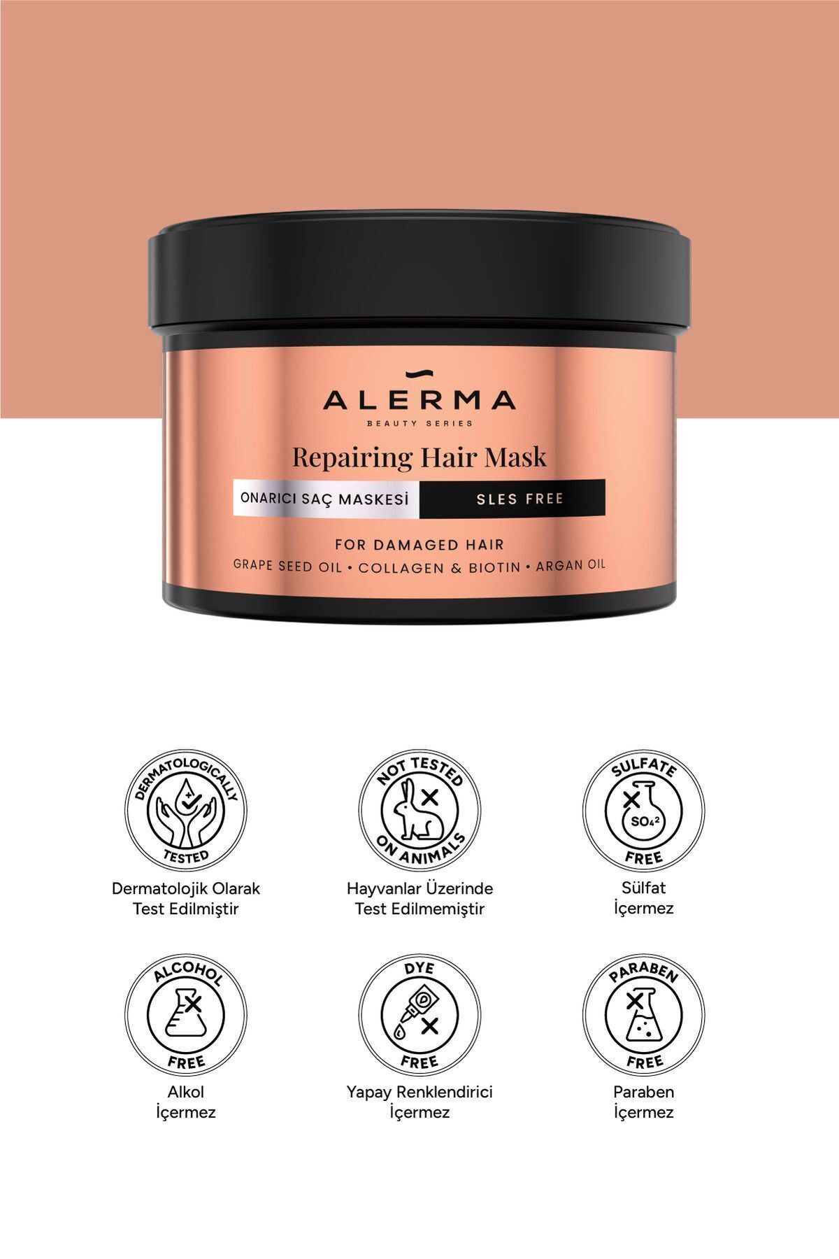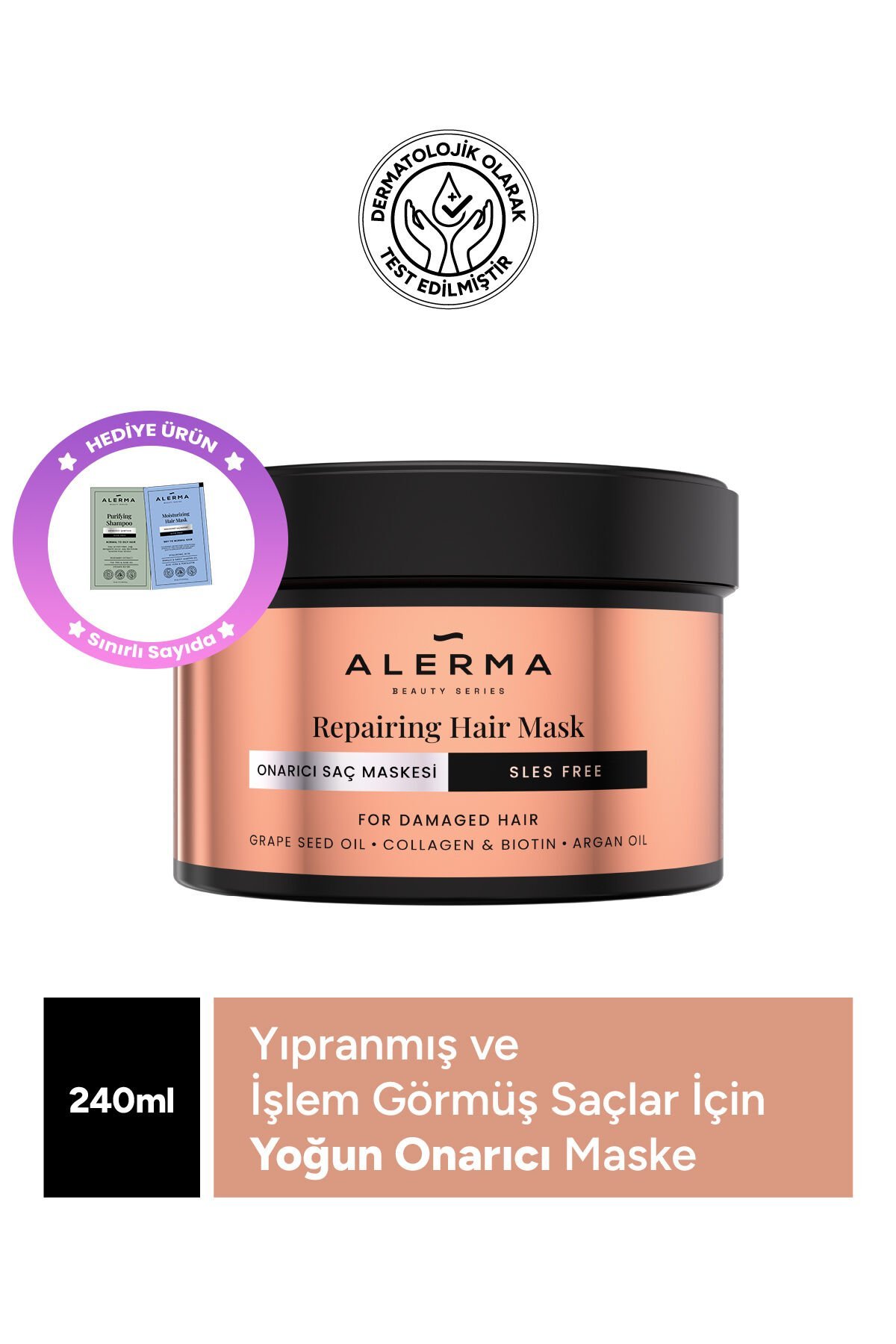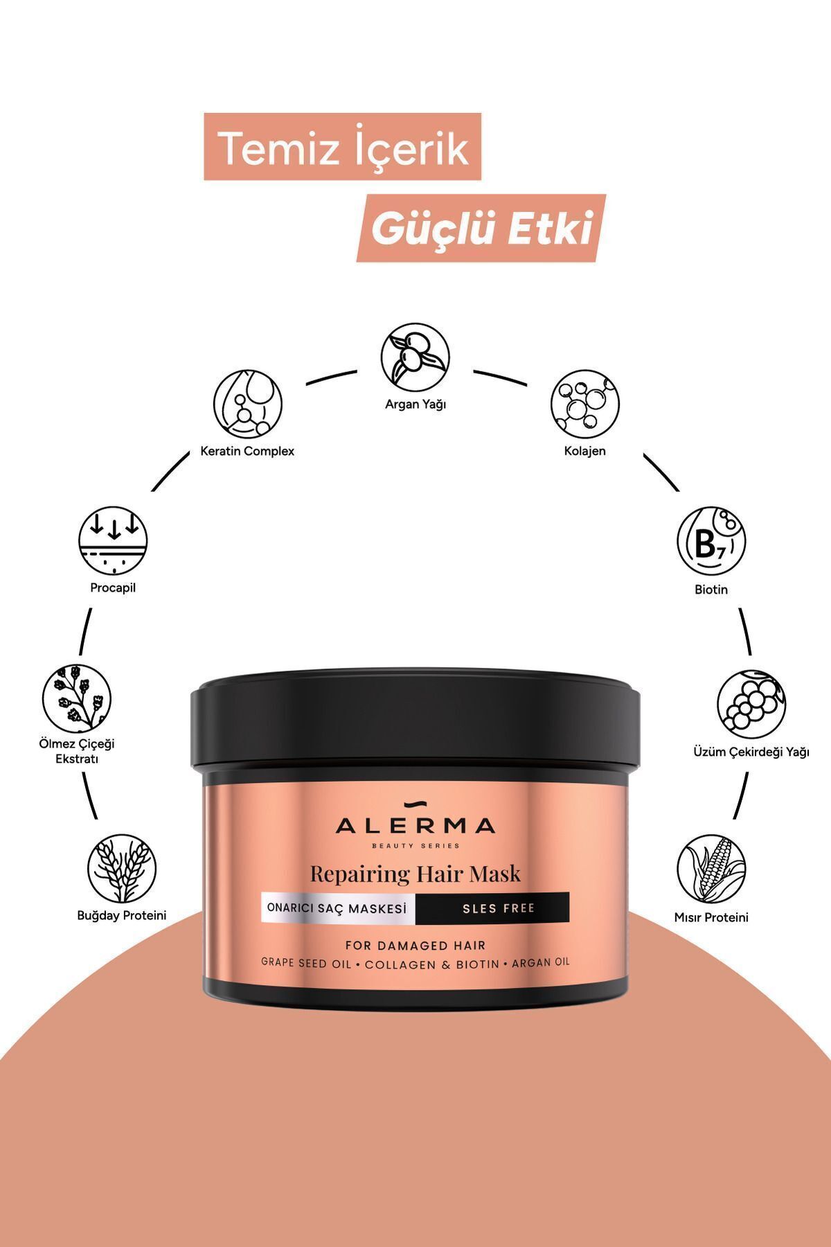 Alerma Onarıcı Saç Maskesi’nin içeriği Prokapil, Kolajen, Ölmez Çiçek Özü, Argan Yağı ve Üzüm Çekirdeği Yağı ile zenginleştirilmiştir. ;İşlem görmüş ve yıpranmış saçları derinlemesine onarmaya destek olurken gücünü ve elastikiyetini geri kazandırmaya yardımcı olur. Saça parlak, volümlü ve canlı bir görünüm sunar. Paraben ve sülfat içermez. Hayvanlar üzerinde test edilmez. ;Kullanım Önerisi: Nemli ve temiz saça yeterli miktarda ürünü masaj yaparak uygulayınız. Maskeyi saçınızda 15-30 dakika bekletiniz. Ardından suyla saçınızı durulayınız. Haftada bir ya da iki kez kullanılması tavsiye edilir. Daha iyi sonuçlar için Alerma Onarıcı Şampuan ve Alerma Onarıcı Saç Kremi ile birlikte kullanınız.